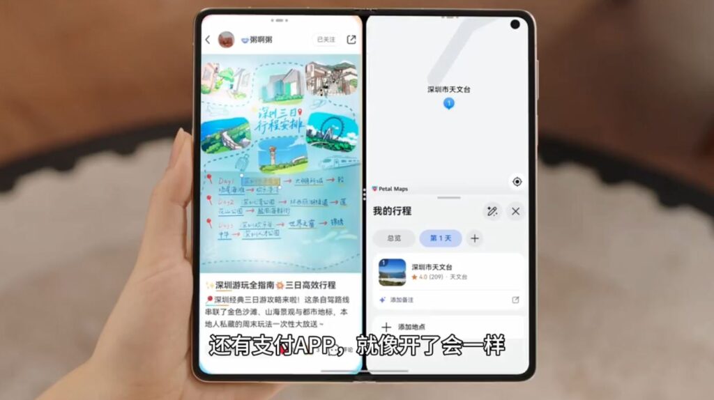 특히 폴더블 스마트폰 Mate X7에서는 A2A 협업 기능이 분할 화면 연동과 결합되어 더욱 혁신적인 경험을 제공한다. 사용자가 샤오홍슈(중국판 인스타그램)에서 여행 가이드를 보다가 두 손가락으로 길게 누르면 분할 내비게이션이 활성화된다. 왼쪽에서 가이드 속 관광지를 클릭하면 오른쪽 화면의 바이두나 가오더 지도가 즉시 해당 위치를 표시하고, 여러 장소가 언급된 경우 자동으로 최적 경로까지 계획해준다.