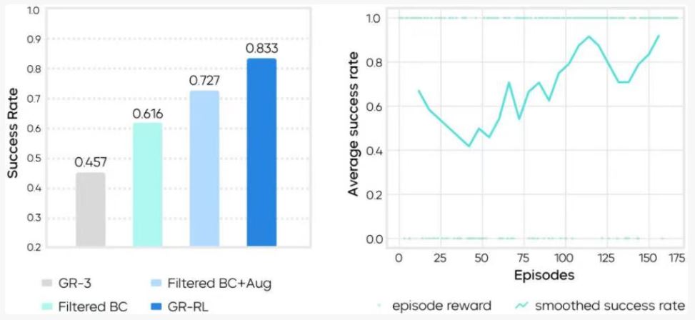 GR-RL 훈련의 두 번째 단계는 실제 로봇에서 진행된다. 연구팀은 가이드 강화학습 방법을 채택하여, 관절 차원에서 무작위로 교란하는 대신 모델이 생성하는 동작의 잠재공간 노이즈를 조정했다. 이를 통해 실제 탐색에서 점진적으로 더 높은 보상의 전략에 접근할 수 있게 했다.