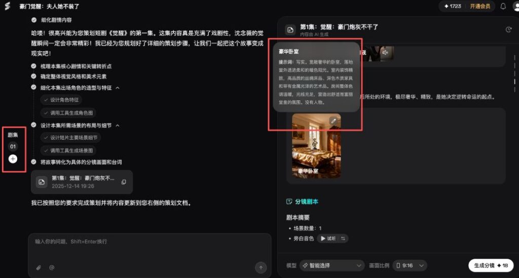 스토리보드 생성 후에는 각 스토리보드 이미지 상단의 캔버스 편집 및 입 모양 조정 기능을 클릭하거나, 왼쪽 하단 대화창에 프롬프트를 입력해 이미지를 재생성 할 수 있다. 생성된 숏드라마 영상에서 여주인공의 이미지는 다양한 장면 전환과 표정 변화 과정에서도 높은 일관성을 유지했으며, 어색함이나 단절감이 전혀 없었다.